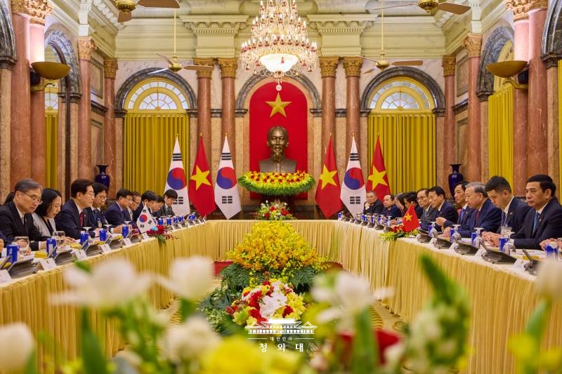 22일 하노이에 도착한 이 대통령은 예포 21발 환영식 속에 또 럼(To Lam) 국가주석 겸 공산당 서기장과 정상회담을 진행했고, 같은 날 저녁 국빈만찬에서는 양국 정상이 서로 상대국 언어로 건배사를 하며 우호 분위기를 띄웠습니다. 이 대통령은 회담에서 "수교 34년 만의 최상 협력"이라는 표현을 썼죠.